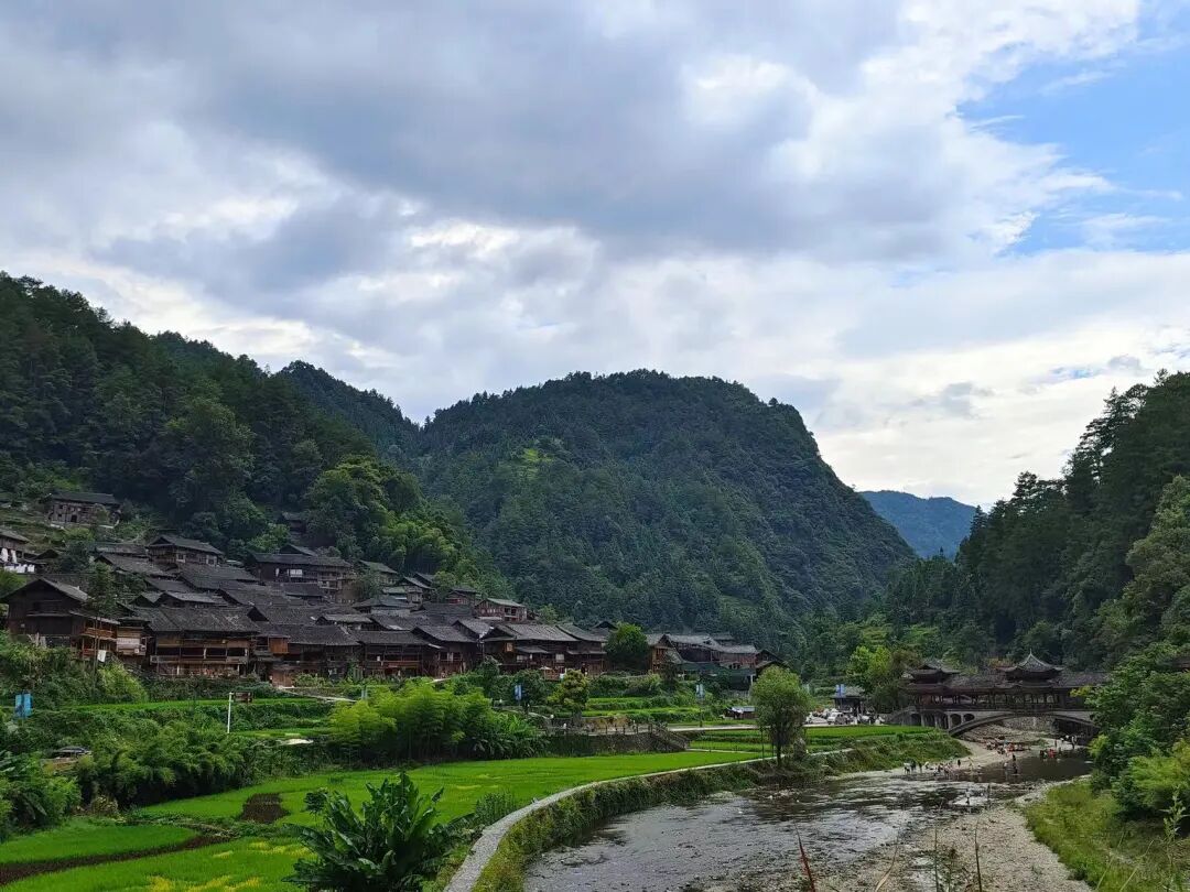 绕到风雨桥上,便可以见到小溪与苗寨、青山与稻田的景致。更好的角度则要从风雨桥尽头绕路而上,走上苗寨对面的观景台。观景台背靠一片稻田,直面溪水和苗寨。眼前景色虽然不似西江千户苗寨那般壮观,却是最真实的苗寨模样。