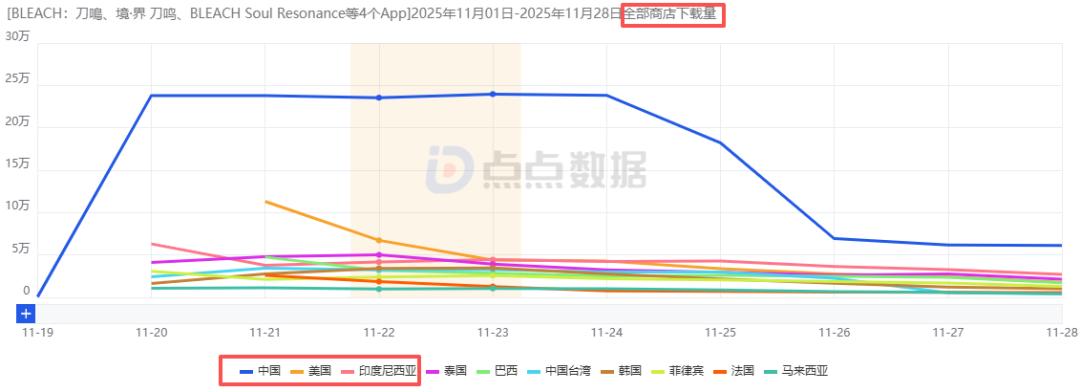 截止目前,游戏公测8天累计下载量约为415.4万(首周下载量为393.3万),中国大陆iOS端、美国、印尼以37.68%、8.92%、8.87%的占比位列前三,以平台来看,APP Store占比略高为63.35%;