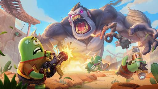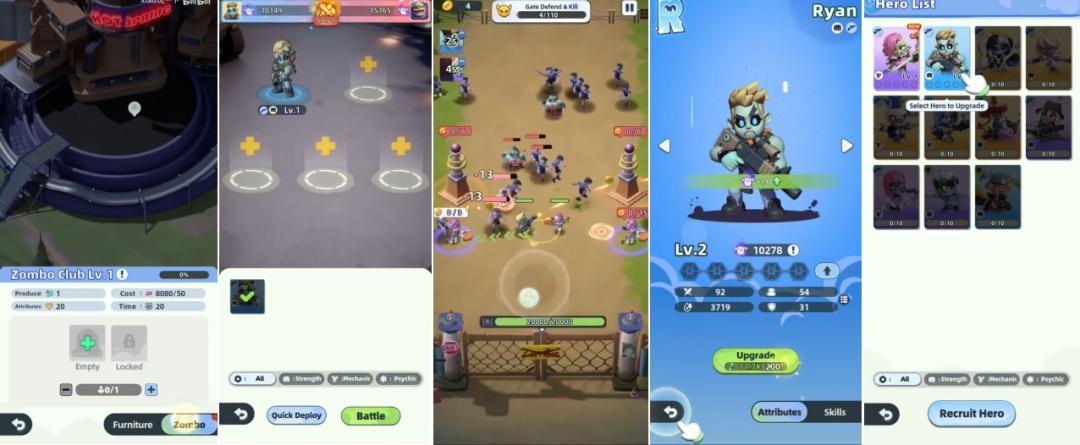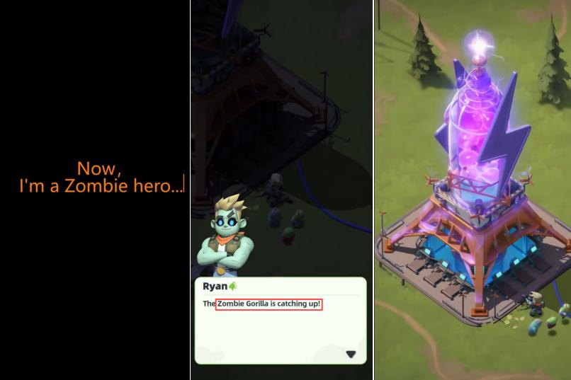 回到游戏层面来简单阐述下《ZombieWorks》,其首先在世界观和美术上做出了区分度,不同于其他僵尸题材SLG中,僵尸一直作为反派角色出现,该作的主角是一位“僵尸英雄”,他需要帮助一群采用萌系卡通风格形象类似小黄人的僵尸同伴,对抗僵尸猩猩以及各类僵尸敌人。