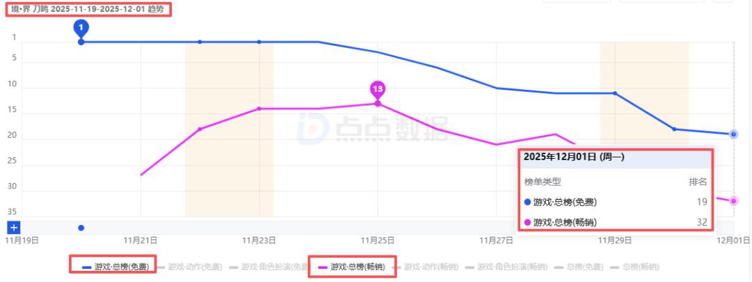 于是时间来到11月21日,《境·界 刀鸣》在全球近170个国家及地区正式开启公测(未上线日本及印度市场),首日便冲上70个区域市场iOS游戏免费榜TOP10,(位于32个区域市场TOP1,包含中国大陆、美国、英国、法国等),期间登上近40个区域市场iOS游戏畅销榜TOP50(国内最高为13名、中国台湾为第9、韩国为第16、美国为第85)。目前其依然位于iOS游戏免费榜国内第32、泰国第8、中国台湾第18、韩国第26的位置。