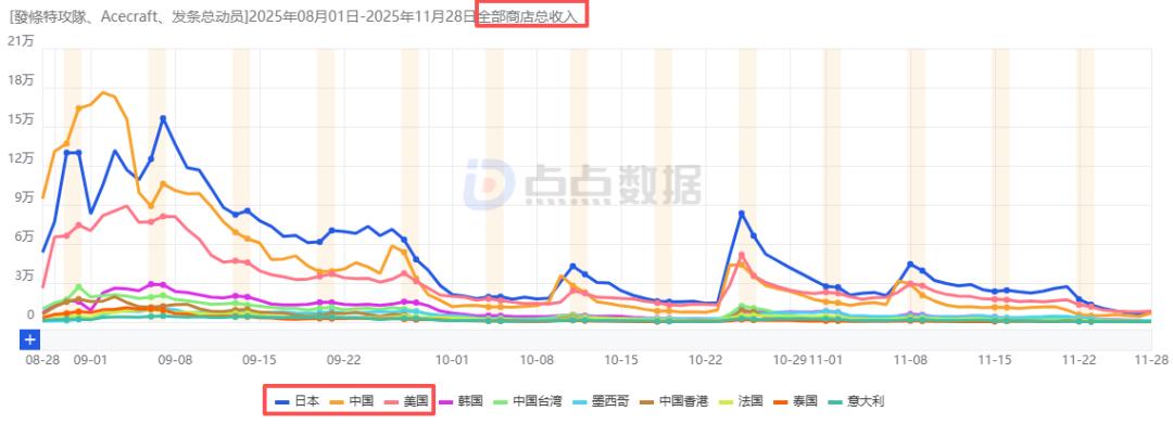 买量方面则是明显倾斜于IP的核心辐射市场,该作最早于今年10月中旬才开始投放(公测前一个半月),公测前两天投放力度才开始明显拉升,亚太地区是其投放量最大的区域,欧美则不够给力,而这也与流水的区域分配几乎一致;