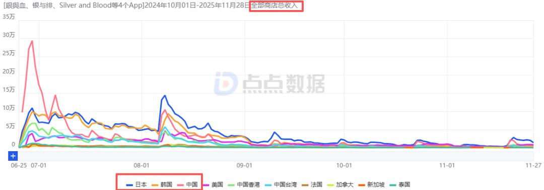 紧接着是6月26日全球同步上线的暗黑哥特幻想二次元RPG《银与绯》(移动端及PC端),其首月流水虽然冲至8011万,但此后开始快速下滑,目前月流水已经不足800万元,其累计流水约为1.7亿元,其中日本、韩国以及中国iOS端分别占比24.8%、19.66%、18.09%位列TOP3。