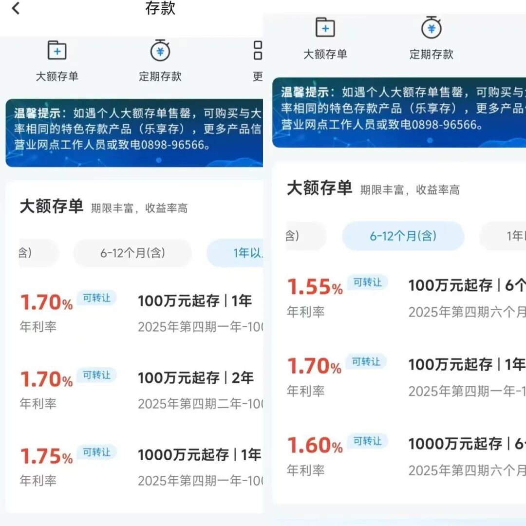 而在部分银行,“高利率”大额存单的准入门槛已被抬升至百万元级。记者查询海南银行手机银行发现,其大额存单产品的准入门槛普遍处于高位,多数产品要求100万元起存,个别起存门槛甚至高达1000万元。12月3日,其手机银行显示的在售产品中,一款1年期大额存单起存金额高达1000万元,但年化利率仅为1.75%。与此形成对比的是,另一款门槛为100万元的2年期产品年利率为1.7%,前者利率仅高出后者0.05个百分点。