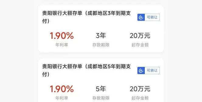 贵阳银行手机银行显示,该行在成都地区发售从3个月到5年不等的各期大额存单,其中3年及5年期大额存单年利率最高且相当,均为1.90%。但在贵阳地区,记者咨询得知,该行各期大额存单执行利率更高,年利率甚至能到2%以上,但均已售罄。