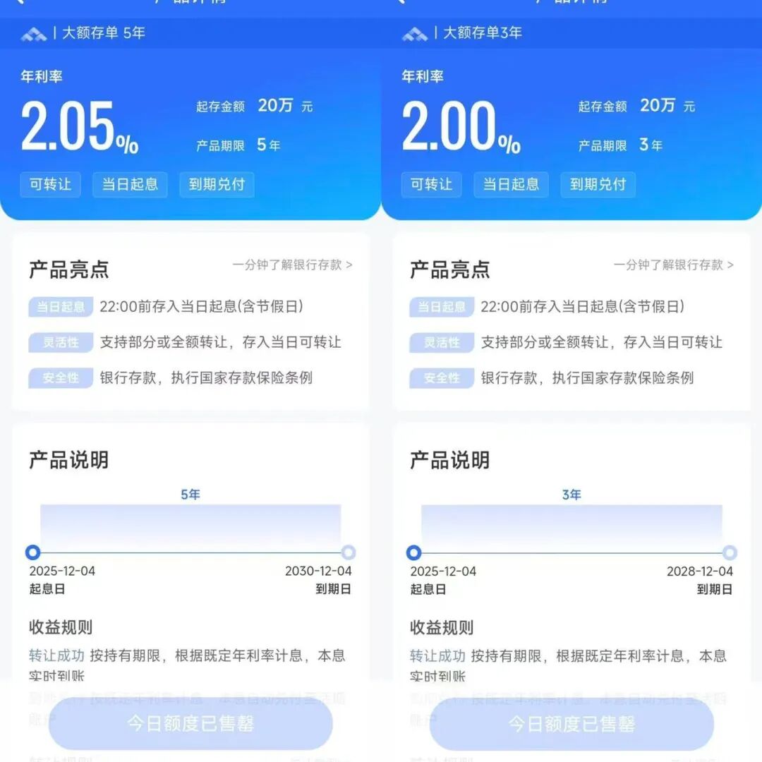例如,12月4日,在四川,泸州银行手机银行显示,该行仍在发售5年期大额存单,20万元起存,年利率为1.9%;在河北,邯郸银行手机银行显示,该行5年期个人大额存单20万元起存,年利率为1.85%,发行截止日期为2025年12月31日。