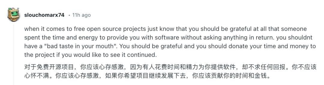 对于免费的开源项目,你首先要明白:有人花时间和精力为你提供软件,却不求任何回报,你就应该心怀感激。你不应该感到“心里不舒服”或有怨言。如果希望这个项目能够继续下去,就应该投入自己的时间或金钱去支持它。