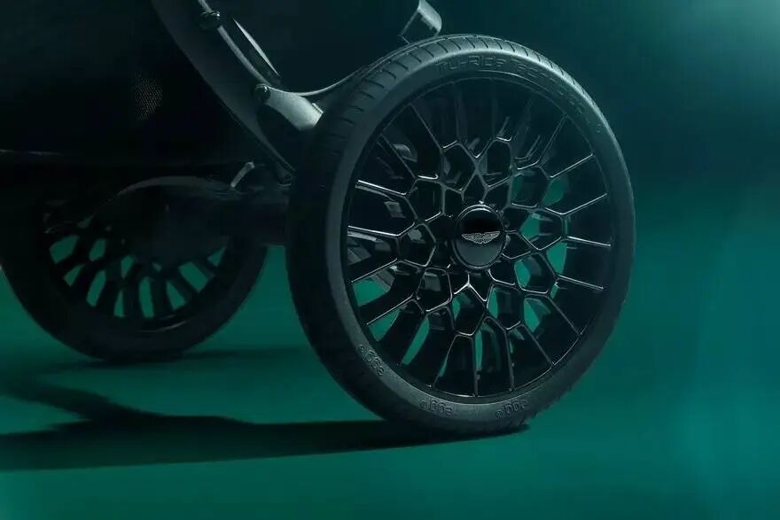 这款推车从阿斯顿·马丁价值百万美元的 Valour 与 Victor 超级跑车中汲取灵感,采用蜂窝状辐条轮毂设计;车架饰以精致绗缝细节,试图在触感层面复刻其奢华座舱的体验。