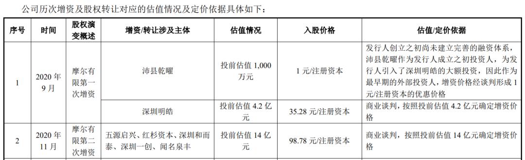 时间回到2020年9月,成立仅三个月且尚未建立完善融资体系的摩尔线程,迎来了第一位投资人“沛县乾曜”。又因“沛县乾曜作为发行人成立之初投资人,为发行人引入了深圳明皓的大额投资”,故而沛县乾曜作为最早期的外部投资人,以1元/注册资本的优惠价格、对应公司整体估值1000万元的价格顺利入场。 而同期深圳明皓的入股价格为35.28元/注册资本。