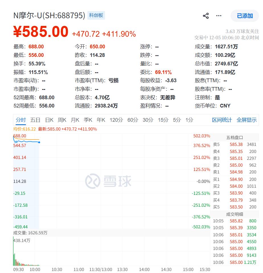 12月5日,通用GPU创业公司摩尔线程正式在科创板挂牌上市,摘得“国产GPU第一股”称号。上市首日,摩尔线程市场情绪高涨,开盘价650元/股,市值达到3055亿元。目前股价为585元/股,较发行价涨411.9%,总市值达2749.67亿元。