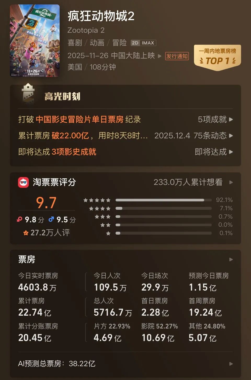 综合灯塔、猫眼平台数据,截至12月5日上午,影片总票房已接近23亿元,预测总票房约38亿元。就此来看,《疯狂动物城2》将成为助力2025年度中国电影总票房迈过500亿元大关的主将,也有望坐上今年票房总榜仅次于《哪吒之魔童闹海》的第二把交椅。