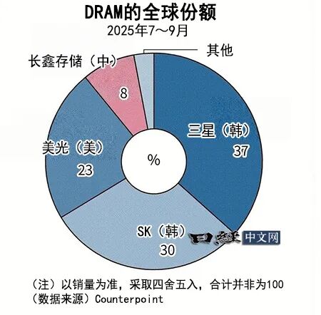 在用于短期存储的DRAM领域,长鑫存储技术(CXMT)扩大了市场份额。2025年7~9月为8%,居世界第4位。2024年同期为6%。长鑫存储技术推进增产用于个人电脑和智能手机的通用产品,被认为在中国国内拥有4成左右的市场份额。