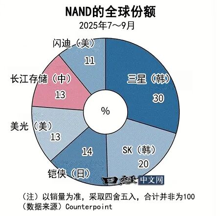 调查公司香港Counterpoint的数据显示,长江存储在全球NAND出货量中所占的份额在2025年1~3月首次达到10%。2025年7~9月同比增长4个百分点达到13%,份额直逼世界第4位的美国美光科技。以中国品牌的笔记本电脑和智能手机为中心,长江存储的产品获得的采用正在增加,全年的市场份额有望超过1成。