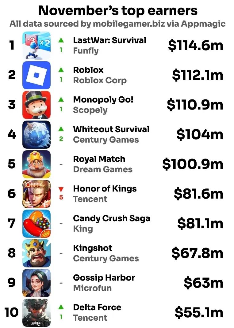 近日,外媒Mobilegamer.biz发布了2025年11月的全球手游收入榜。(注:数据来源AppMagic,统计范围不包括第三方安卓渠道、网页商店及广告收入,且已扣除平台分成)