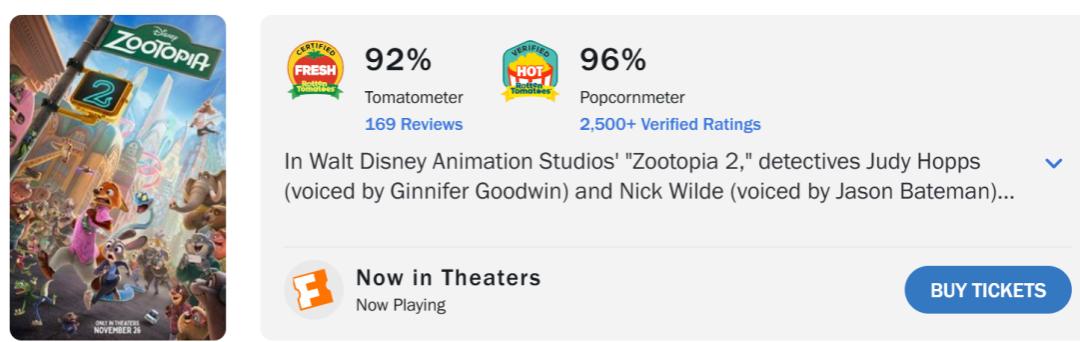 口碑上,《疯狂动物城2》烂番茄新鲜度92%,爆米花指数96%,IMDb7.7,豆瓣评分虽没有开分时高,下滑了0.2,但还是被40万+网友打出了8.5,在合家欢电影之中属于绝对的高分之作。