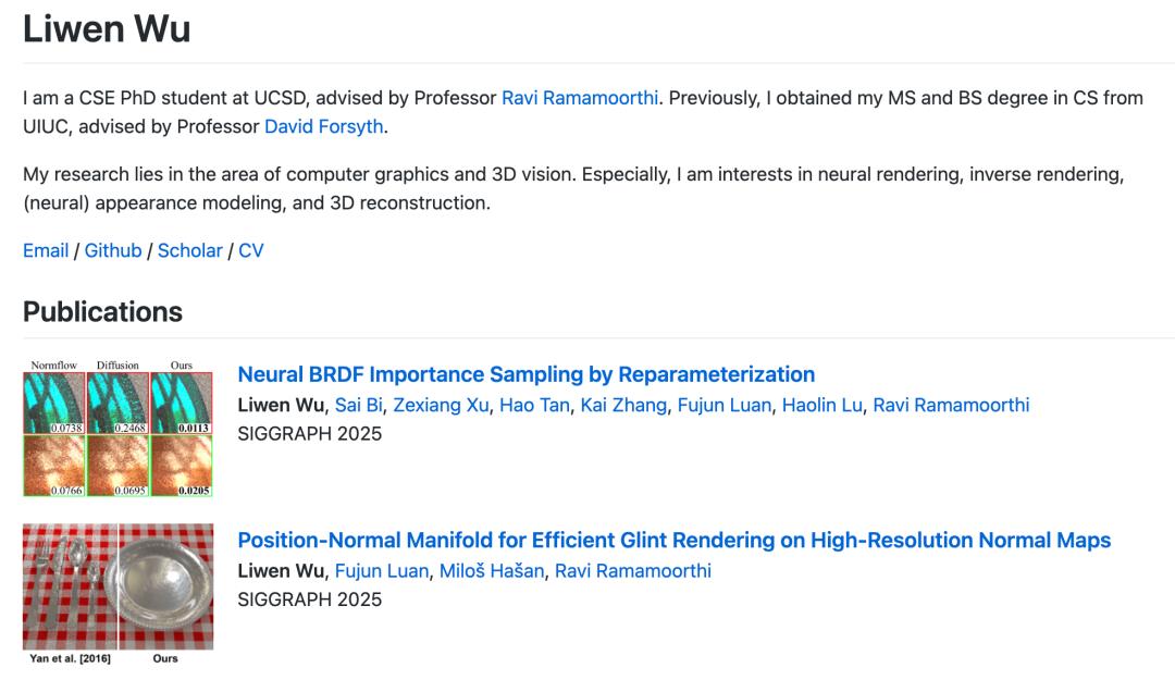 Liwen Wu是UCSD计算机科学与工程系的博士生,导师是Ravi Ramamoorthi教授。他的主要研究兴趣集中在计算机图形学和3D视觉的交叉领域,特别是神经渲染、反向渲染和材质建模。他致力于通过结合神经技术与物理渲染原理,提升渲染的真实感与计算效率,为创建逼真的虚拟世界提供技术支撑。