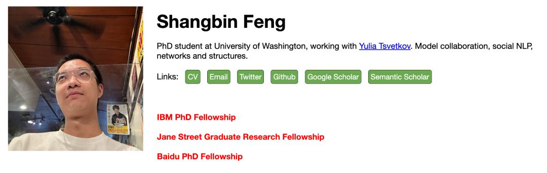 Shangbin Feng是华盛顿大学的博士生,导师是Yulia Tsvetkov。他的研究愿景是推动「模型协作」,即让多个在不同数据上由不同人员训练的机器学习模型能够相互协作、组合与互补。他致力于构建一个开放、去中心化且协同化的AI生态系统,解决单一模型在知识覆盖和隐私保护方面的局限性。