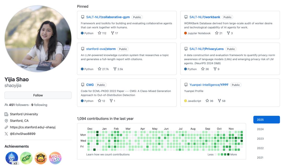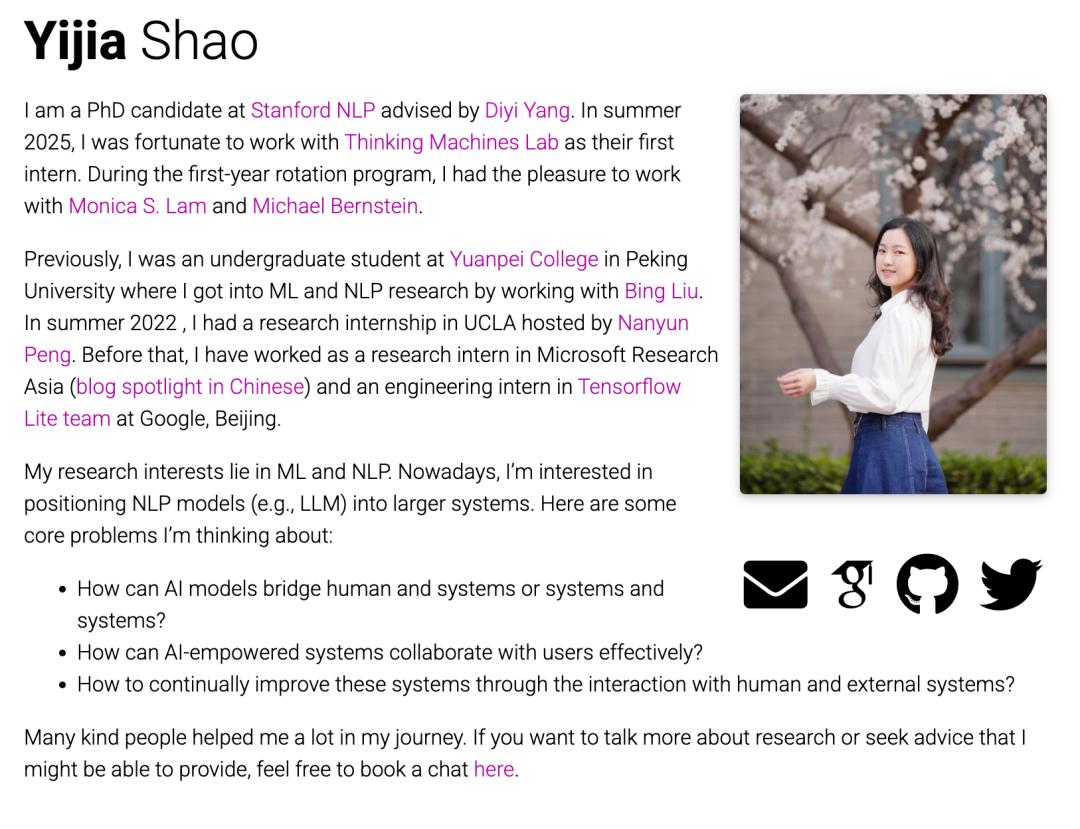 Yijia Shao是斯坦福大学的博士生,师从Diyi Yang教授。她的研究重点是人机协同(Human-AI Collaboration)。她致力于开发能够在任务执行过程中与人类进行有效沟通和协作的AI智能体,并设计新型的人机交互界面。她的工作旨在探索AI如何通过理解人类意图和反馈,更好地辅助人类完成复杂的知识密集型任务。