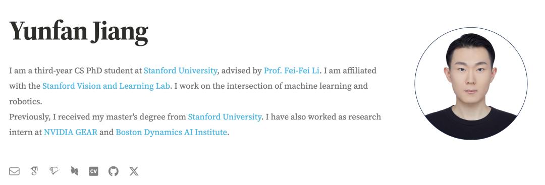 Yunfan Jiang是斯坦福大学计算机科学系的博士生,导师是李飞飞(Fei-Fei Li)教授。他的研究目标是构建通用的机器人系统,使其能够执行复杂的日常任务。他通过融合现实世界的全身操控数据、大规模仿真环境(如Minecraft)以及互联网级的多模态监督数据,开发可扩展的方法来训练具备高度适应性的机器人智能体。