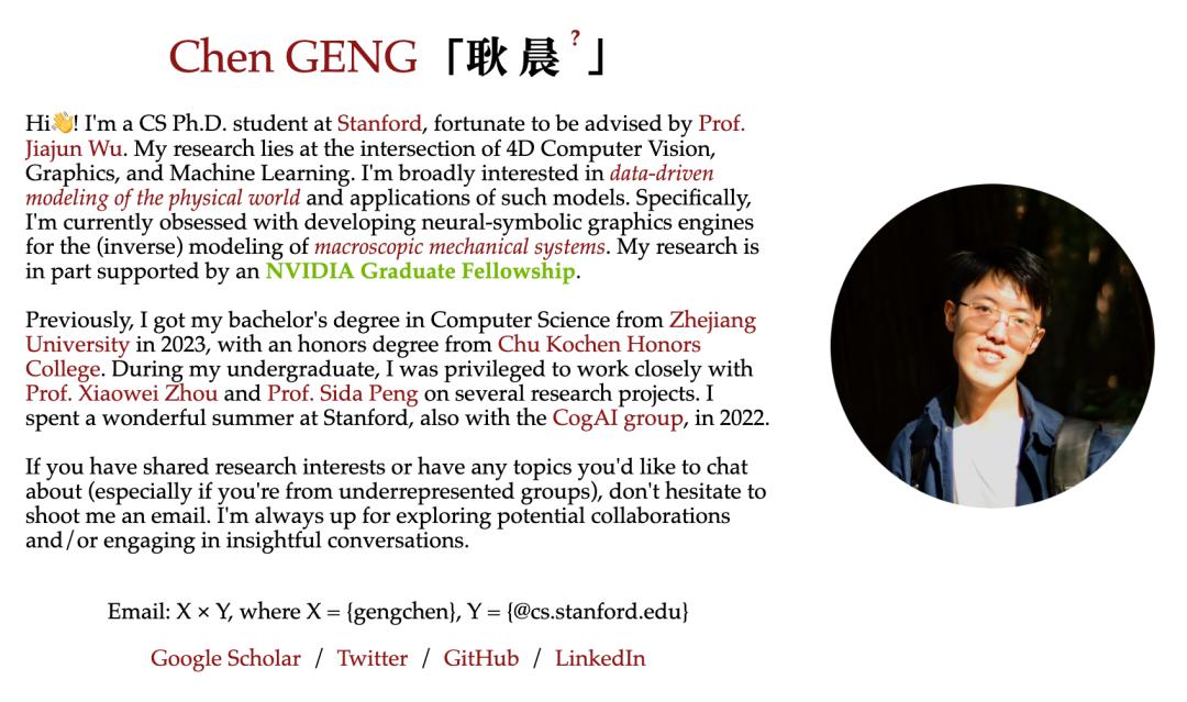 Chen Geng是斯坦福大学的博士生,导师是Jiajun Wu。他的研究兴趣位于计算机图形学与4D视觉的交叉点。他致力于利用可扩展的数据驱动算法和物理启发原理,对四维物理世界进行建模。他的工作推进了面向机器人与科学应用的物理基础三维与四维世界模型(World Models),特别是在动态场景的生成与理解方面。