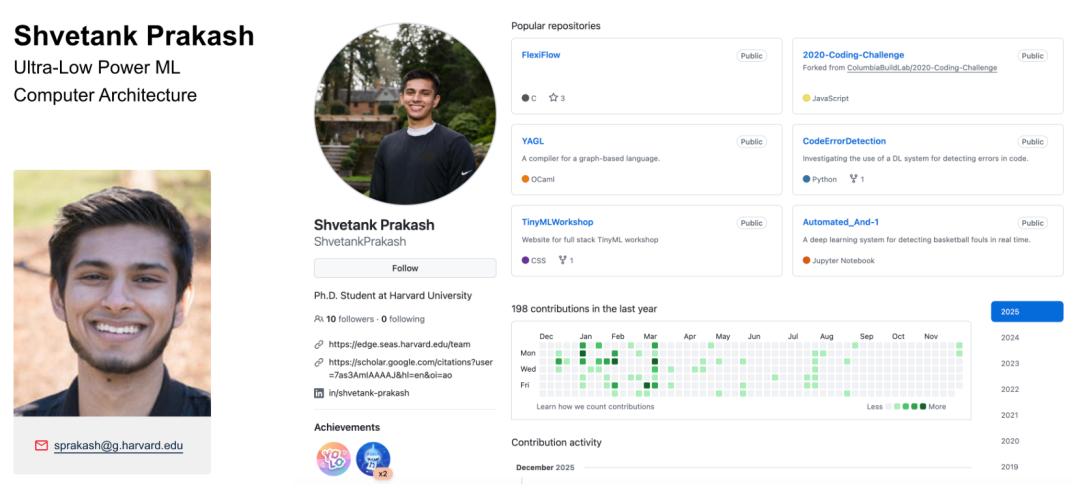 Shvetank Prakash是哈佛大学的博士生,隶属于边缘计算实验室(Edge Computing Lab)。他的研究专注于为AI智能体构建优化的基础设施,特别是针对资源受限的边缘设备。他通过利用新型算法、精选数据集和「智能体优先」的设计理念,推进硬件架构与系统设计,使AI能够更高效地部署在下一代计算平台上。