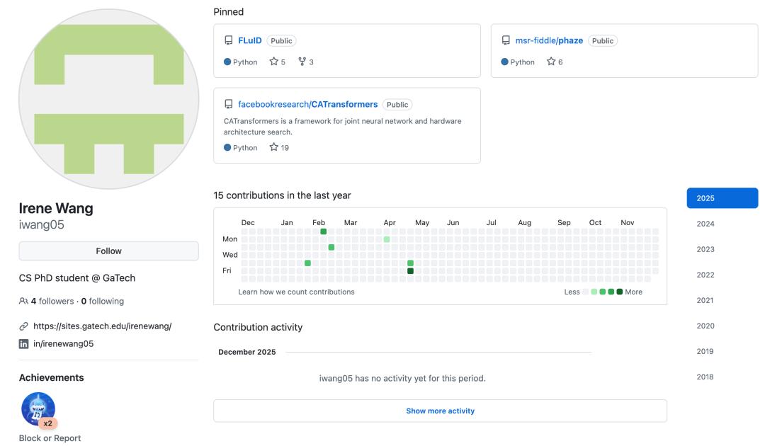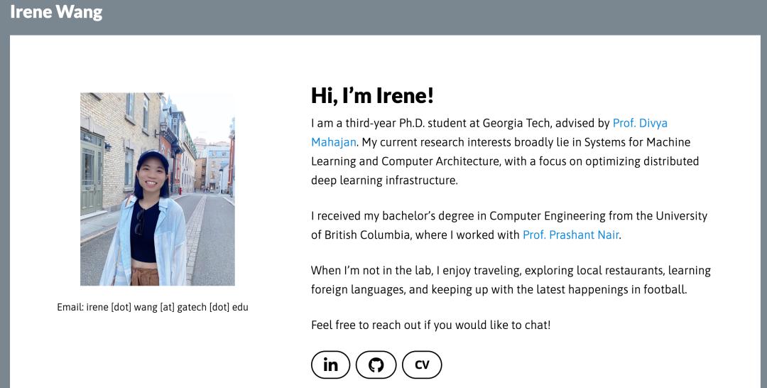 Irene Wang是佐治亚理工学院的博士生,导师是Divya Mahajan。她的研究致力于解决大规模AI训练中的效率与可持续性问题。她开发了集成加速器架构、网络拓扑与运行时调度的协同设计框架(Co-design Frameworks),旨在优化分布式深度学习系统的性能和能效,推动绿色AI计算的发展。