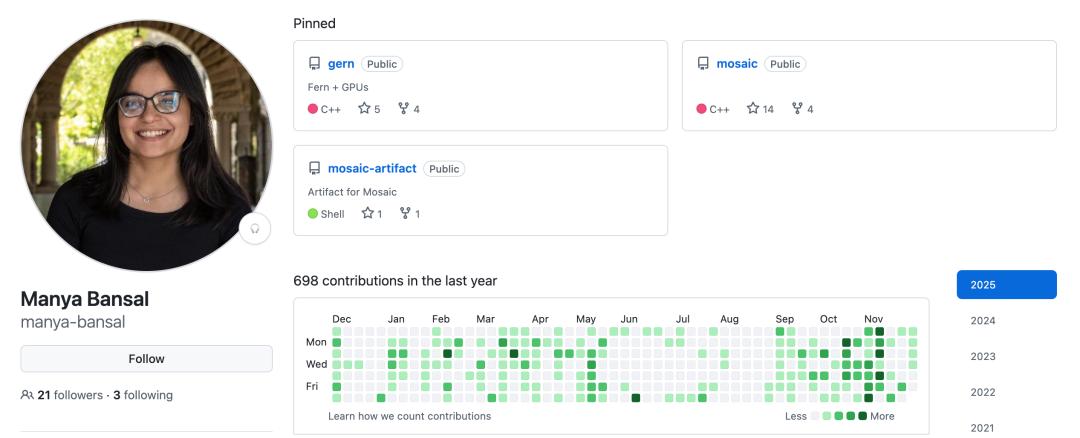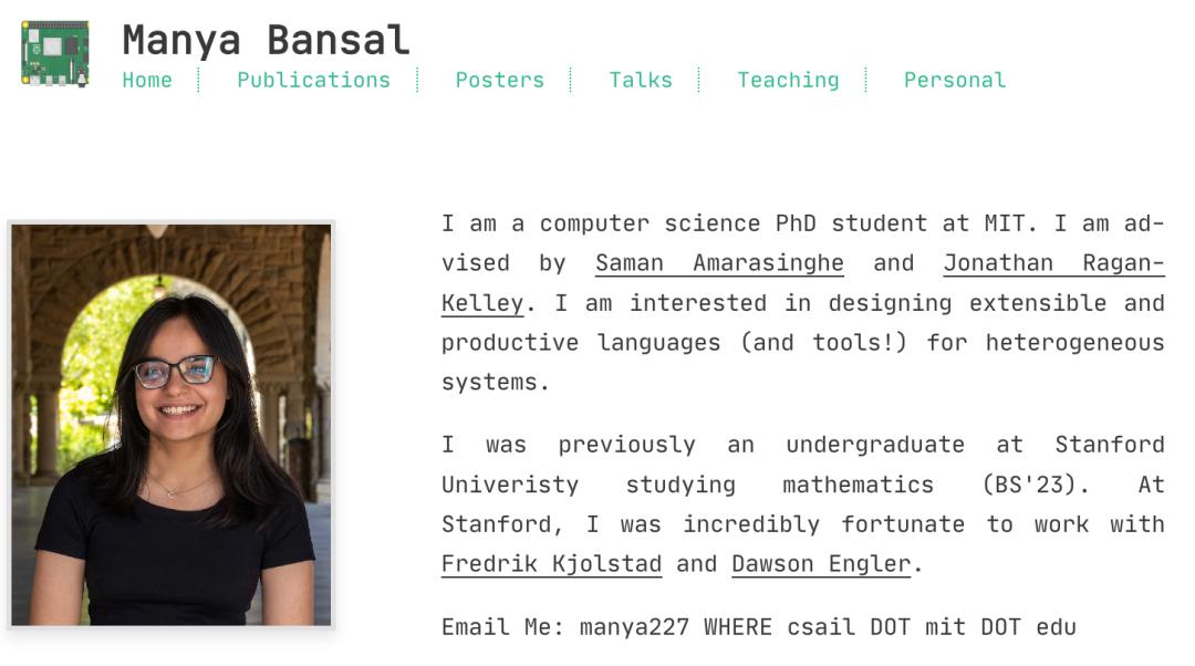Manya Bansal是MIT的博士生,由Saman Amarasinghe和Jonathan Ragan-Kelley指导。她的研究致力于为现代硬件加速器设计新型编程语言和编译器。她开发的系统允许开发者编写模块化、可复用的高性能代码,旨在解决异构计算系统中的编程复杂性,同时保留对底层硬件的精细控制能力,以实现峰值性能。