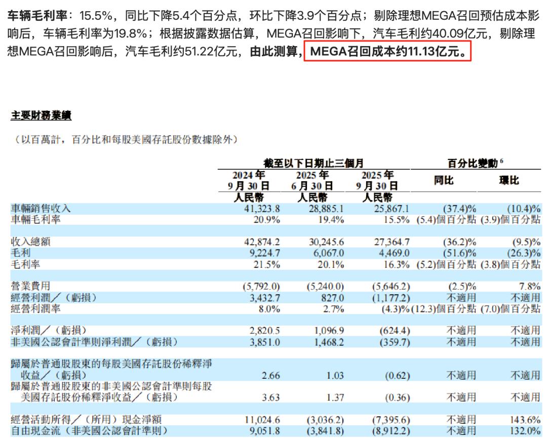 图/Mega召回成本与理想汽车部分财务数据 来源/互联网 新能源观截图