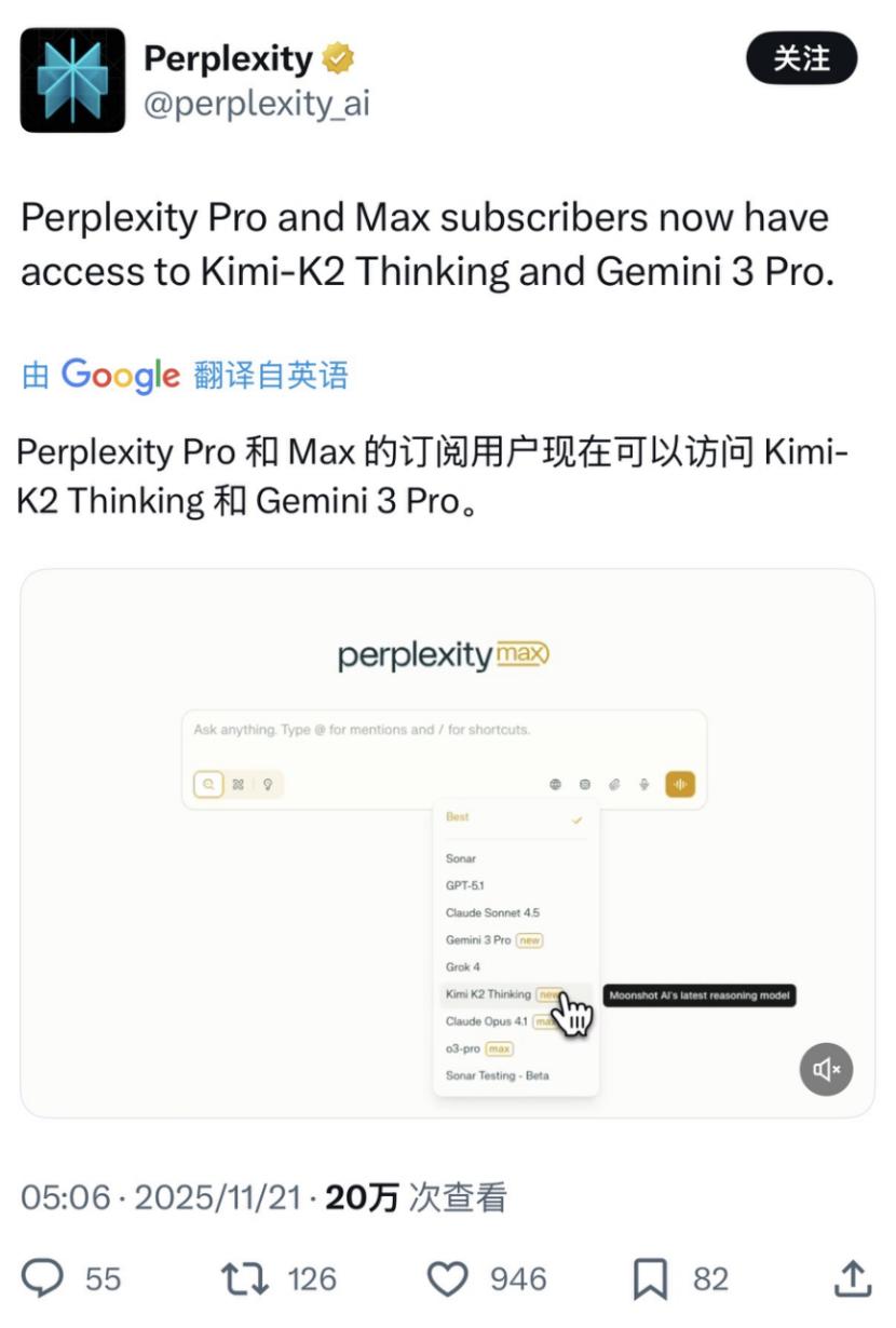 今年下半年,月之暗面先后拿出了两个奠定地位的模型Kimi K2和Kimi K2 Thinking。前者作为非思考模型,在多个测试中拿到开源模型的SOTA;后者不仅能力大幅升级,还成为著名AI搜索Perplexity目前唯一接入的国产模型,同时被官宣的,正是刚刚屠榜的Gemini3 Pro。而上一个有此待遇的中国模型,是风光无限的DeepSeekR1。