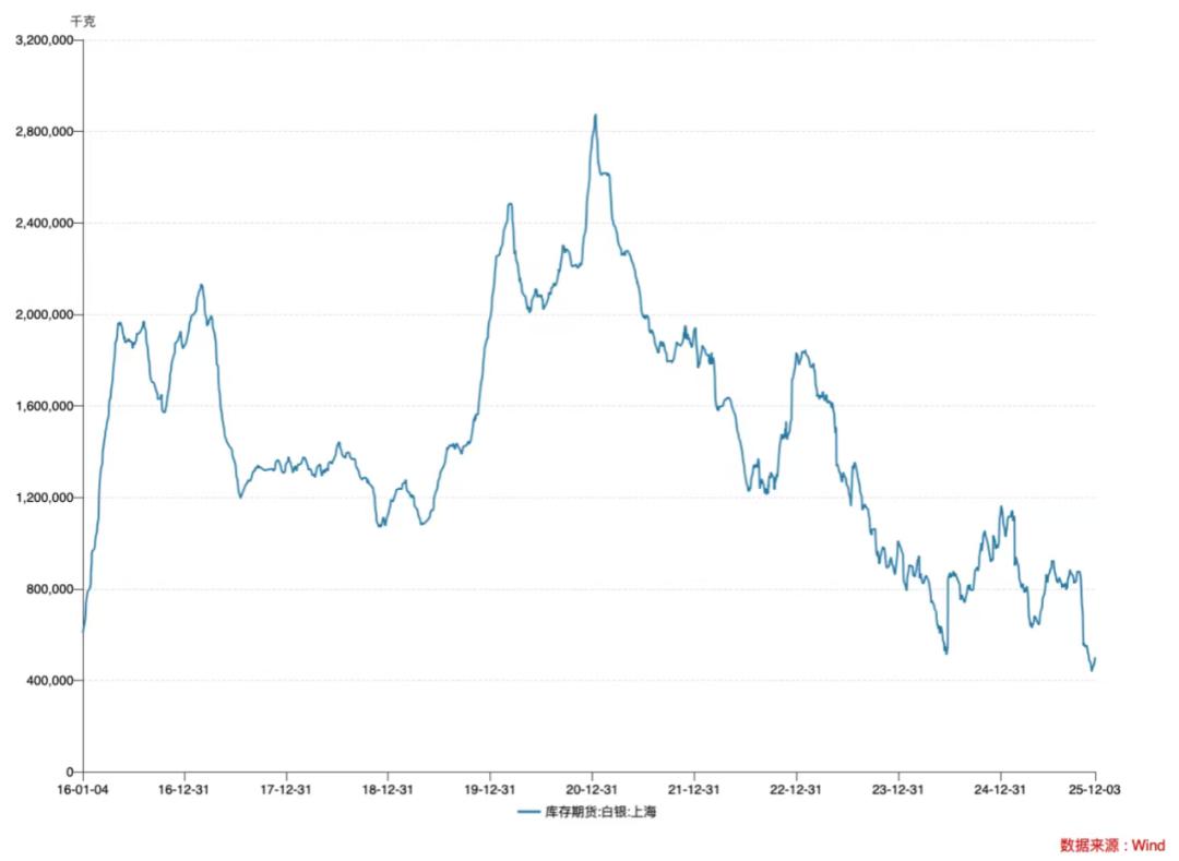 图:上期所白银库存,单位:千克;资料来源:wind,36氪