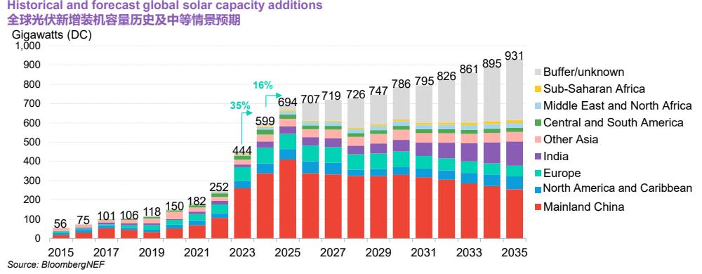 进入2025年,光伏装机量的增长,进一步引发了白银需求的爆发式增长。受136号文的影响,国内光伏行业在今年出现抢装潮,国内强劲的装机需求叠加欧洲等地的向好态势,共同带动全球光伏装机再创新高。根据彭博新能源的预计,今年全球光伏装机将会达到694GW,同比增长16%。