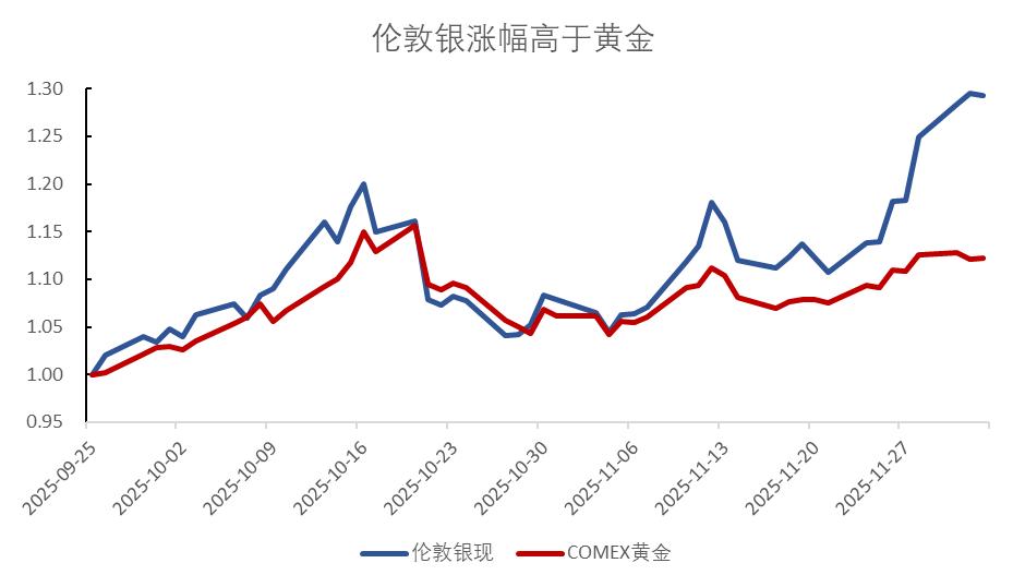 随着上海与伦敦市场之间白银库存跨境转移的持续,不仅导致上海市场的可流通库存急速枯竭,也进一步为银价提供了上行动能。截至发稿,11月24日以来,沪银最大涨幅已经接近14%,COMEX白银期货的最大涨幅更是超过18%。