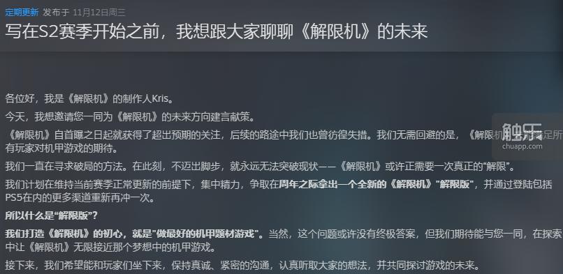 在《解限机》S2赛季开启前,郭炜炜发布的一则公告