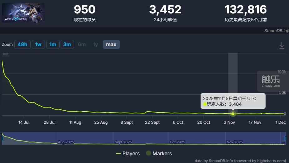 游戏在今年2月新品节开启二测,官方公布全球在线人数峰值超过30万。在7月公测时,据SteamDB显示,游戏曾以13万在线人数峰值开局,一个月后在线人数峰值滑落至1万人以下,近期在4000人次上下徘徊。