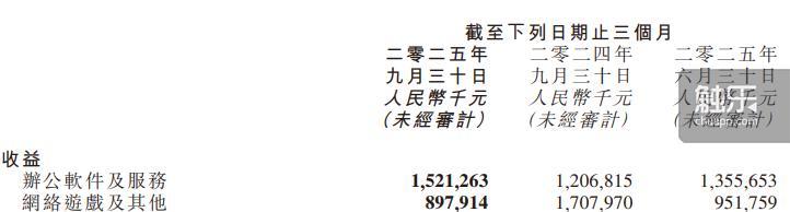 金山软件2025年Q3财报“网络游戏及其它”收益截图