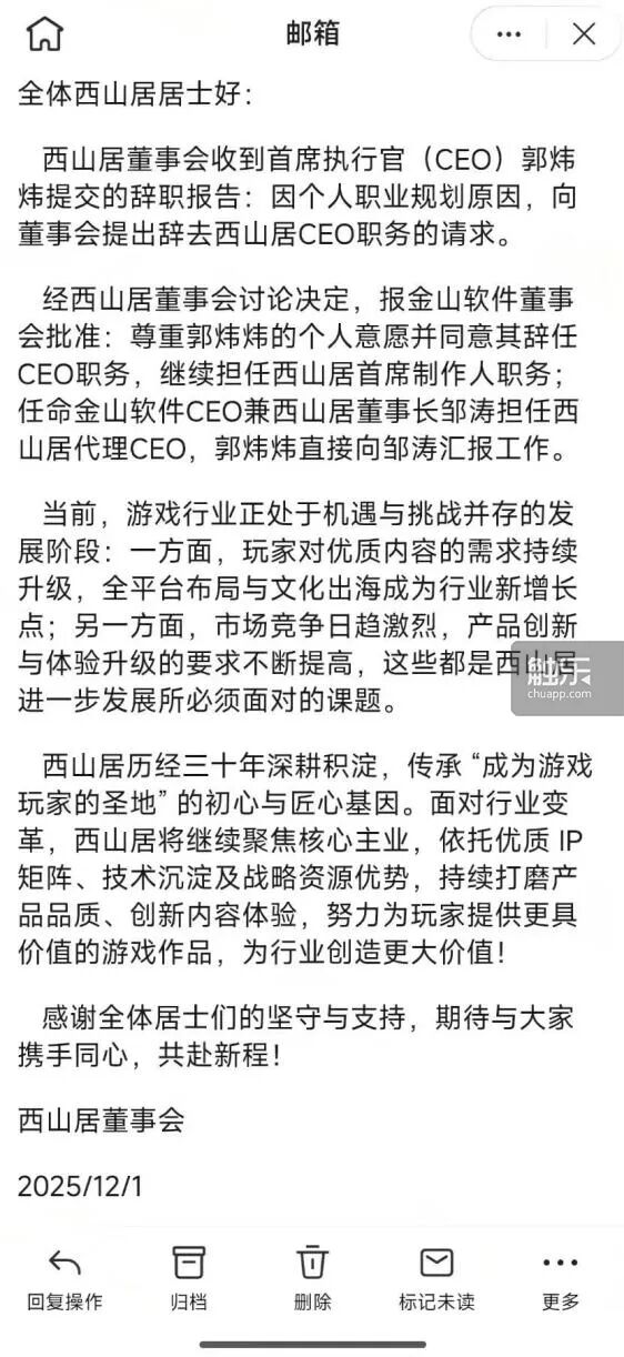 2025年12月1日早间10点左右,一封邮件传送至西山居员工邮箱中。邮件的内容是,原西山居CEO郭炜炜向董事会提出辞呈,卸任西山居CEO,继续担任西山居首席制作人,金山软件CEO邹涛将出任代理CEO。