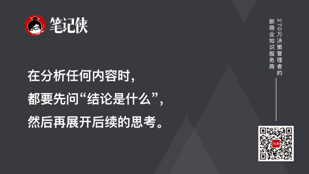 这里有一个关键提醒:如果一份内容找不到明确的结论,即便它辞藻华丽、数据丰富,也没有实际意义。在分析任何内容时,都要先问“结论是什么”,然后再展开后续的思考。