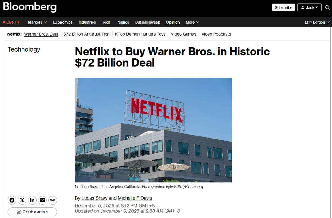 流媒体巨头奈飞宣布,将以720亿美元天价收购华纳兄弟。