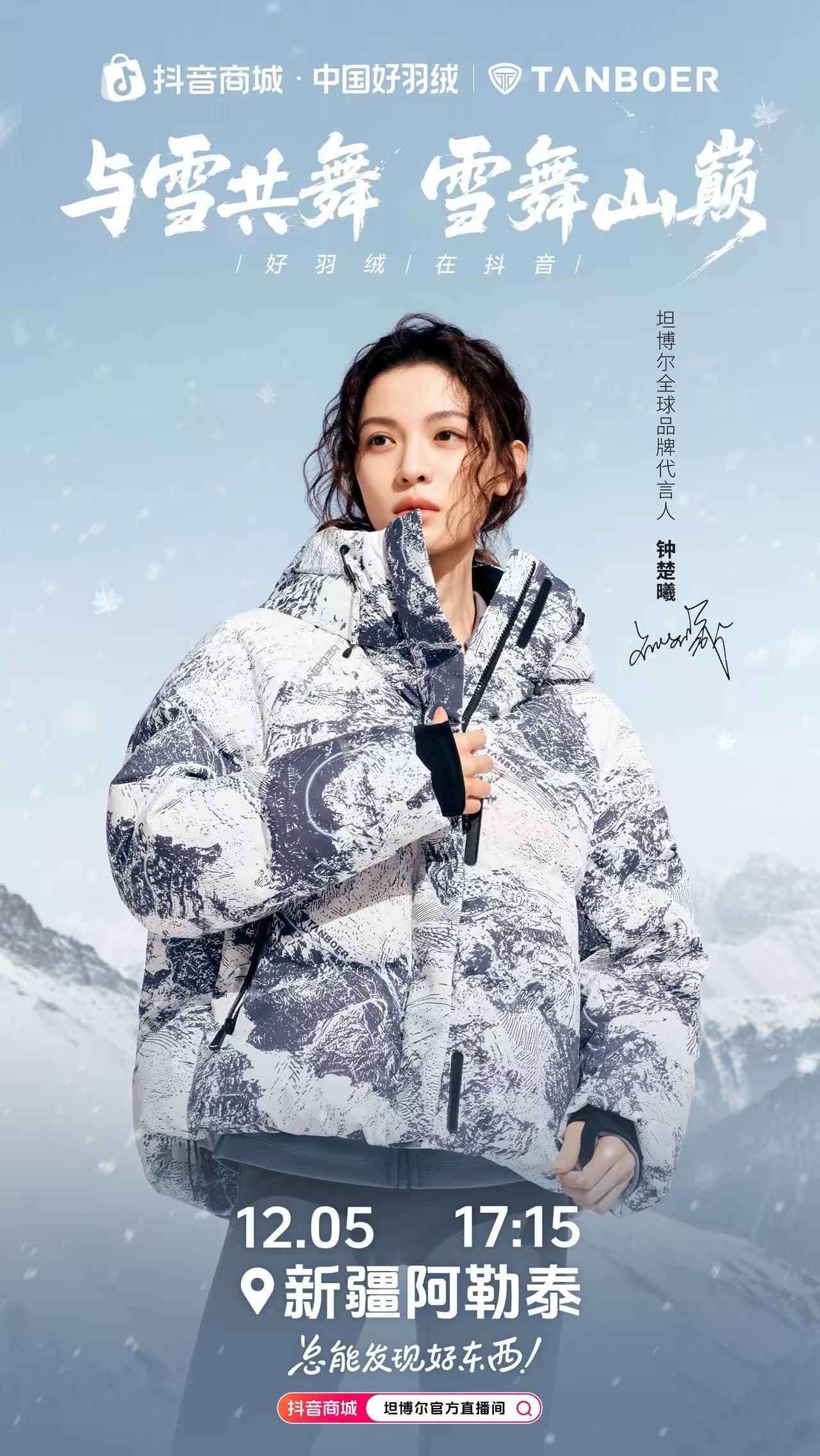 本次「与雪共舞 雪舞山巅」雪友派对结合抖音中国好羽绒IP,邀请全球品牌代言人钟楚曦化身坦博尔全民“户外造型师”空降坦博尔雪顶直播间,通过分享、互动、体验、挑战、宠粉等多维形式,带领观众开启浪漫「雪山夕阳派对」。品牌亦邀请知名滑雪运动推广者黄嘉蓝亲临现场,与广大雪友一同实地感受坦博尔滑雪系列出众性能。