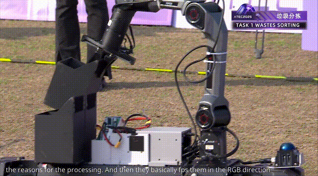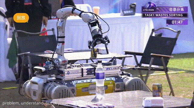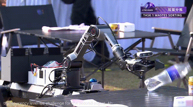 它要求,机器人将三类道具:饮料纸盒、香蕉皮、塑料瓶,精准分类并扔到垃圾桶里。