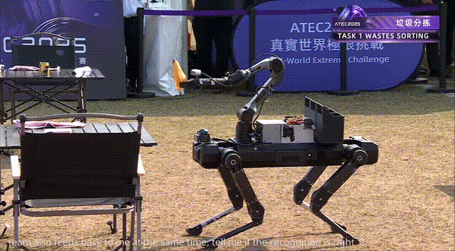 四足机器人全凭自身感知与决策,成功完成了纸盒、香蕉、塑料水瓶的分拣。