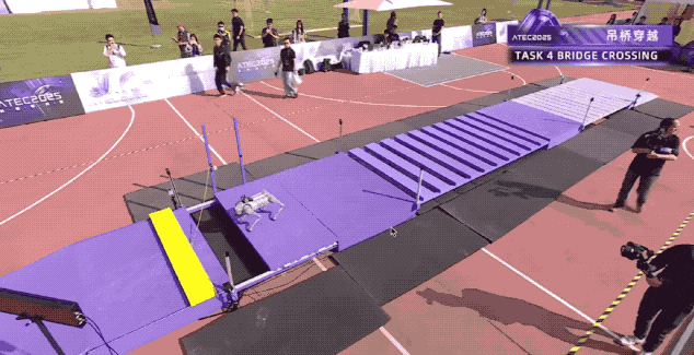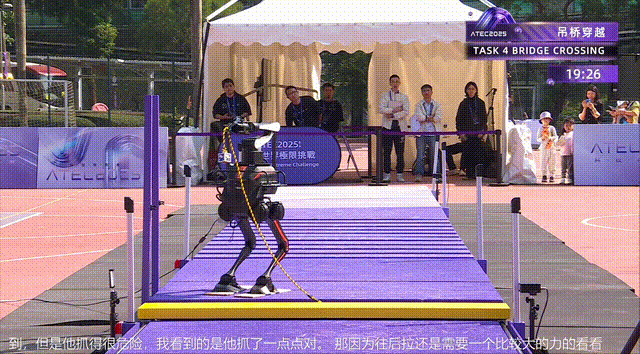 现场,吊桥穿越中的四足机器人:即便跳过了「地狱难度」的前半程,却倒在了终点附近