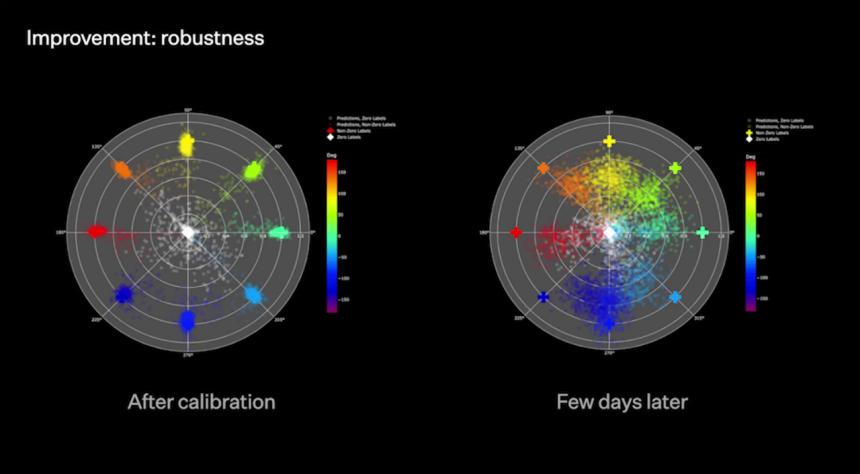 Neuralink的神经解码信号随时间发生漂移。左图为校准完成后的点云分布,右图为数天后的分布。