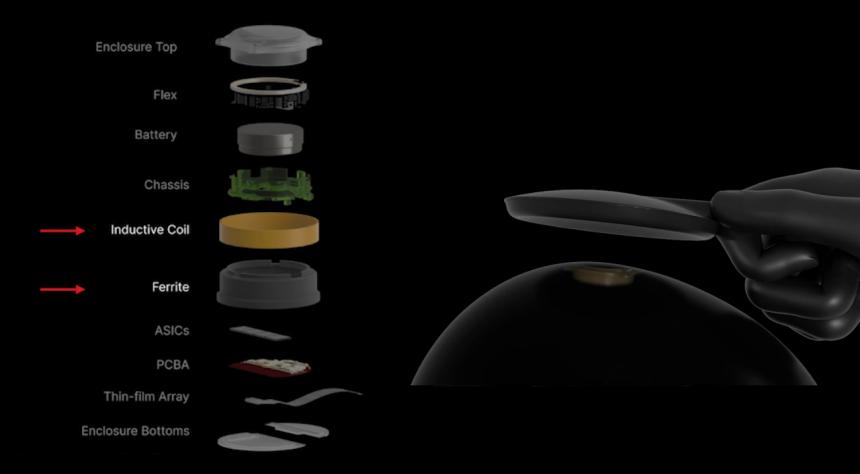 Neuralink植入体的分层结构:包括电池、ASIC芯片、柔性电极阵列,以及用于体外无线充电的感应线圈与铁氧体结构。整个装置最终嵌入头骨内,与皮肤齐平,无需外露。