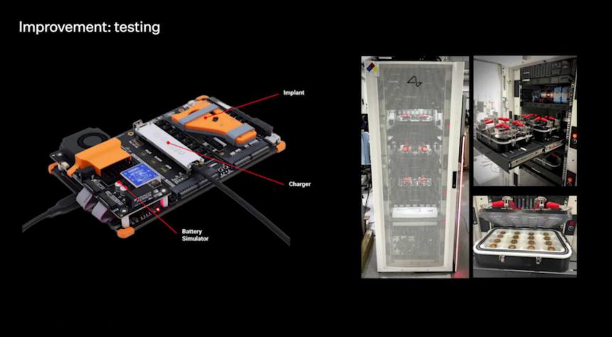 Neuralink的植入体测试体系:左为implant+充电与电池模拟器的硬件测试板,右为多层机架式老化测试装置与高温「脑液」加速老化池。