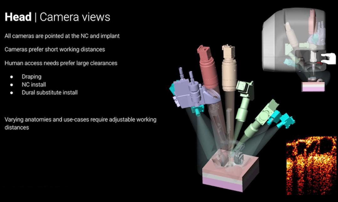 Neuralink手术机器人头部的多摄像头视觉系统示意图:多组显微镜从不同角度同时监控开颅窗口,并结合OCT(右下)实时追踪脑组织的深度与运动。