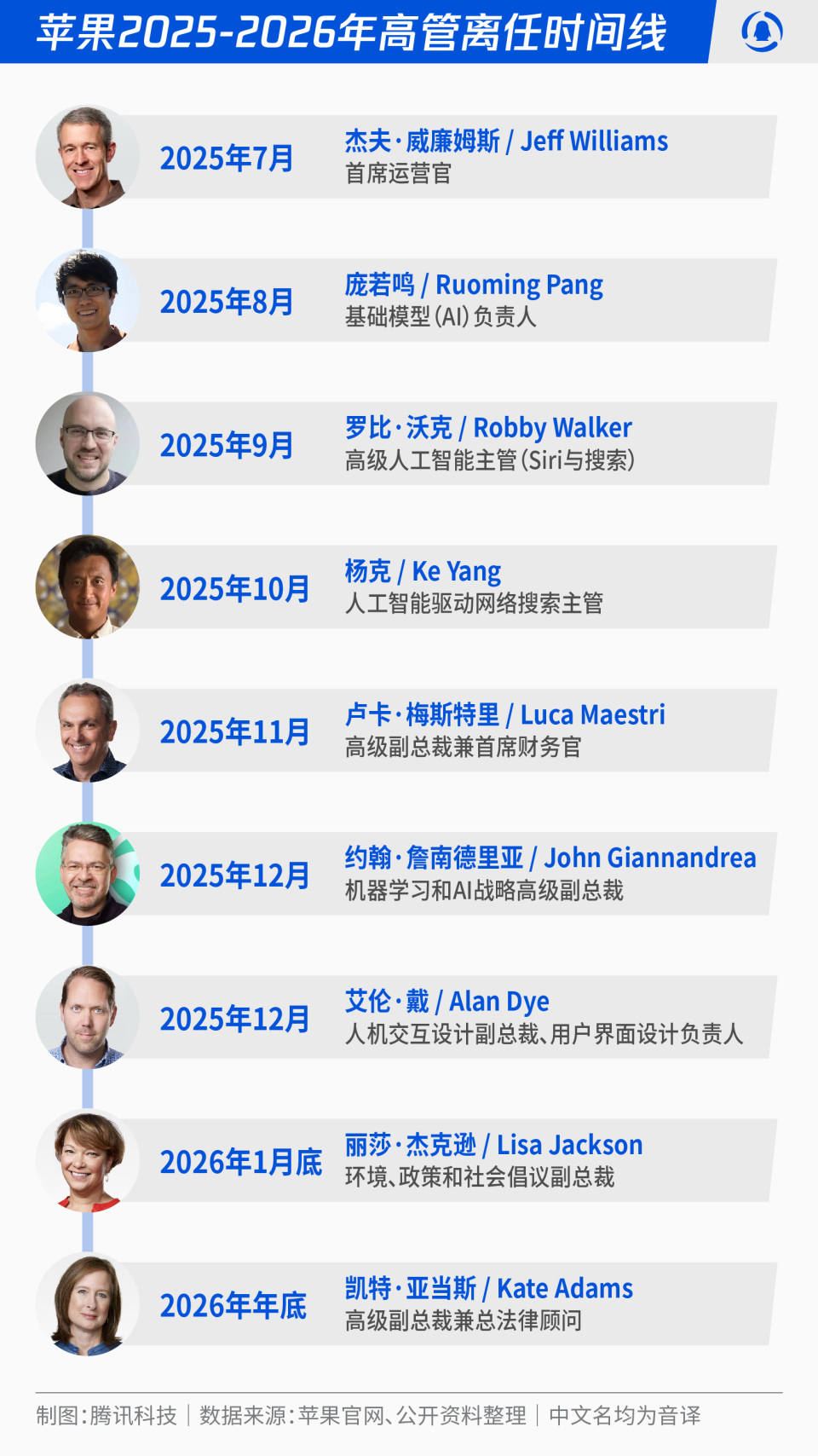 首席运营官杰夫·威廉姆斯已于2025年11月退休,他在苹果任职27年,自2015年开始担任首席运营官。同时,自2013年起领导苹果环境、政策与社会事务的丽莎·杰克逊,也已定于2026年1月退休。