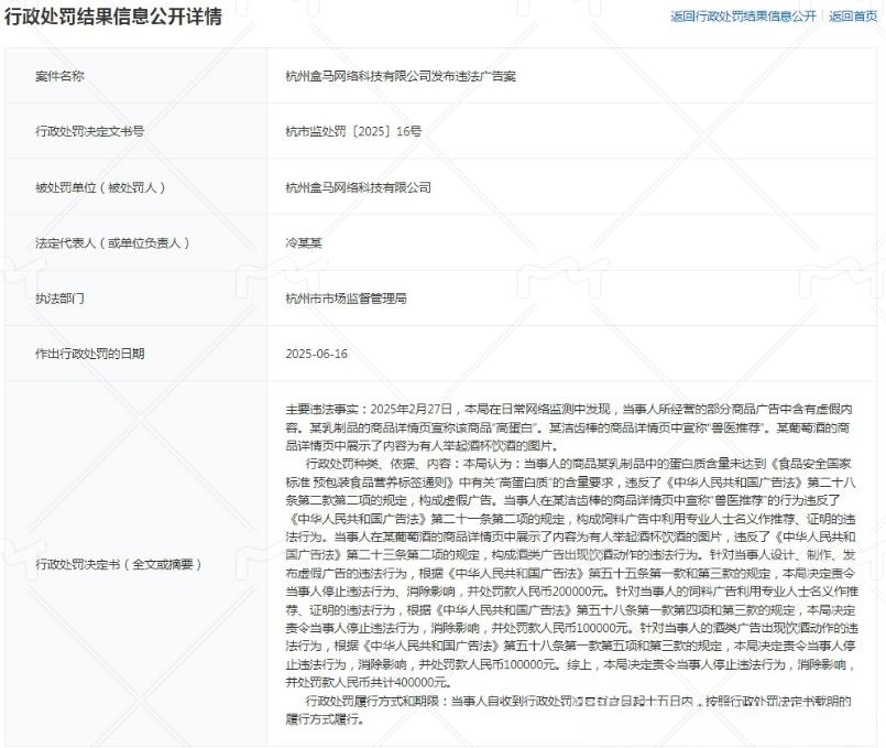 2025年6月16日,杭州盒马网络科技有限公司(下称盒马杭州)因饲料广告使用专业人士做推荐、证明,被处以罚款10万元。据公告,杭州市市场监督管理局在日常网络监测中,发现杭州盒马网络科技有限公司经营的某洁齿棒商品详情页,存在宣称“兽医推荐” 的内容。经调查,广告中利用专业人士名义作推荐、证明” 的规定,构成违法。