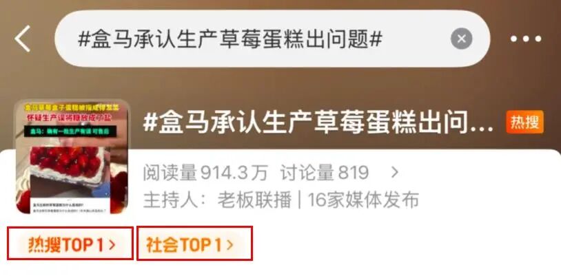 12月8日,“盒马承认生产草莓蛋糕出问题”、“盒马草莓蛋糕或误将糖放成盐”等多个话题在社交媒体平台引发热议,截至发稿前,相关话题已稳居综合榜热搜&社会榜热搜的双料TOP 1。