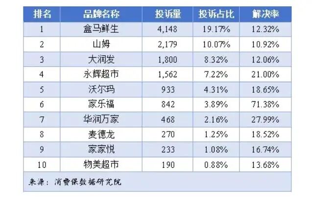 据消费电子杂志社报道,来自消费保数据研究院的数据统计,在主要商超品牌投诉中,盒马鲜生的投诉量为4,148件,占比为19.17%,排投诉榜第一;山姆以2179件、10.07%的投诉占比高居第二,大润发以1800件,8.32%的投诉占比位居第三。