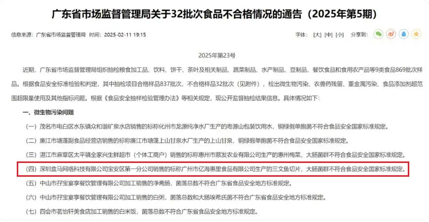 同月,深圳盒马两门店销售的三文鱼切片(大肠菌群超标)和鲜活大鲈鱼(兽药恩诺沙星残留超标)被广东省市场监督管理局点名通报。另有其他门店的寿司、芒果等产品涉及微生物污染和农药残留问题。